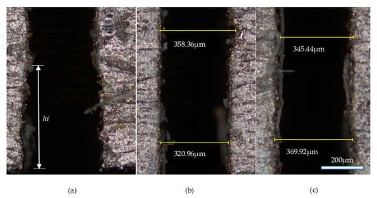 As the value of wire diameter (dw) is constant, the change of the kerf width (KW) results in changes of width lateral spark gaps (Gs). The distance of lateral sparks gap is dependent on the energy of the discharges and affects the process accuracy. Figure 4 shows the photos of the kerfs made during the tests. It can be seen that the edges of the kerfs are fuzzed and measurement of the kerf width might be inaccurate. In the initial section of kerfs (Figure 4a), the machining process is rather unstable. Thus, the section was excluded from the measurements. Figure 4b shows the kerf of the run 1 with measurement lines, while Figure 4c shows the kerf for the run 5, which corresponds to the process conditions of the highest efficiency.