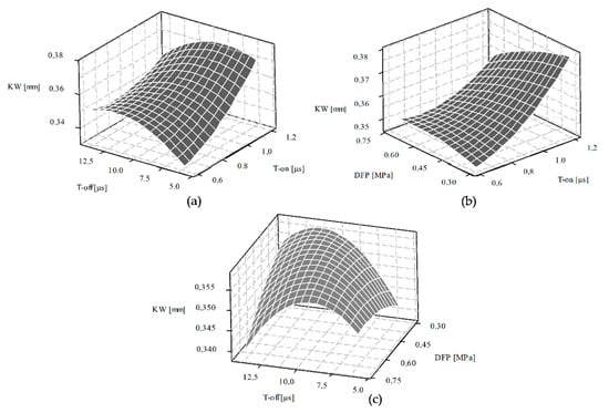 Figure 6 shows the response surface 3D plots representing the KW dependence on the interacting input parameters. As generally seen, the interactions between the particular machining parameter are far more complicated than a simple rule of thumb, and their combined effect on the process response is ambiguous to much extent. Figure 6a, in particular, depicts the variation of KW with pulse-on time and pulse-off time. As can be seen in the figure, higher accuracy (i.e., smaller KW values) can basically be obtained for the combination of lower values of T-on and T-off, conversely to their effect on process productivity (the MRR response), discussed in the previous section. Figure 6b shows that the process accuracy will be higher (i.e., smaller value of KW) with a combination of smaller T-on and DFP, while a small share of the DFP parameter in the increase in the value of the measured response (KW) can be observed. The graph in Figure 6c in turn reveals that the machining accuracy increases (lower KW) for the extreme settings of the value of the T-off parameter (the lowest or the highest), as compared with its mid-settings, however, the range of observed changes in the value of this parameter is quite narrow. At the same time, a limited influence of the DFP parameter on values of the measured response can be noted.
