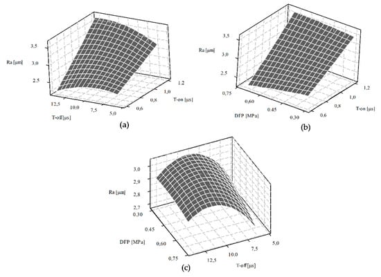 Response surface plots of Ra versus: (a) T-on and T-off, for DFP = 0.5 MPa; (b) T-on and DFP, for T-off = 10 µs; (c) T-off and DFP, for T-on = 0.9 µs.