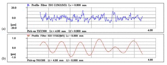 The surface roughness profile (a) and the surface waviness profile (b), as measured in parallel direction to the wire feed.