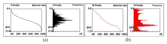 The material ratio curves and frequency density curves for the profiles measured in parallel direction to the wire feed: (a)—for the roughness, (b)—for the waviness.