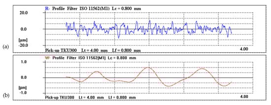 The surface roughness profile (a) and the surface waviness profile (b), as measured in perpendicular direction to the wire feed.