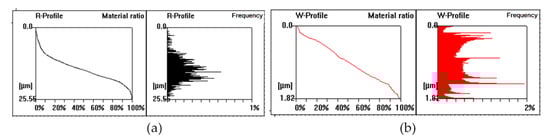 Figure 9 presents a profilogram of the surface after processing, in terms of the roughness and waviness. This presented structure applies to run 8 according to the Table 4. The roughness was filtered from the primary profile using a 0.8 mm cut off filter. Comparing the profiles shown at (a) and (b) in Figure 9, it can be seen that the roughness is the dominant element of the obtained surface structure, and from a practical point of view, the waviness in this structure is insignificant. Figure 10 shows the material ratio curves and the frequency density curve for the profiles presented in this Figure. Based on the above given curves, it can be concluded that the roughness profile unevenness structure is approximately symmetrical, i.e., the range of the peaks and valleys is comparable. The shape of material ratio curve indicates that the main cause of roughness is the EDM machining process is the characteristic of discharges. During the measurements, it was observed that the structure of unevenness slightly changes with the change of the process parameters, i.e., with certain process parameters peaks begin to dominate in the structure, and for other parameters, valley is the dominant element in the surface structure. Due to the fact that the observed changes are of very little importance for the rough machining cuts realized in this research, they have not been included.