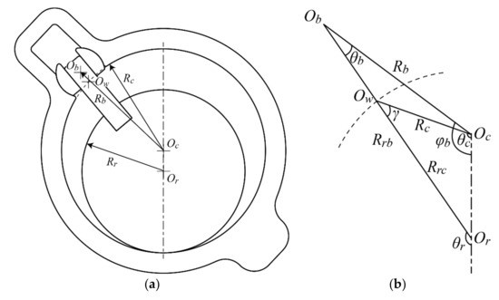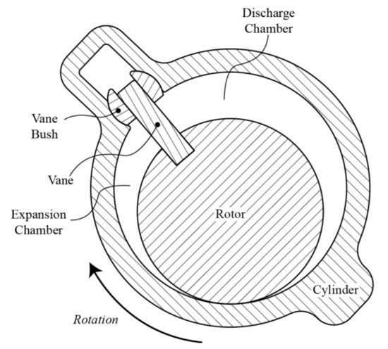 Figure 1 shows a cross-section of a generic RV cylinder-rotor assembly. In the mechanism, the vane is mounted on the rotor and the entire assembly is driven by the rotor component. It is classified as a Type-I RV mechanism and the fixed vane design helps to further reduce the vane side frictional losses due to pressure differential across the vane [36]. The vane bush in the cylinder serves to accommodate the vane movements during operation. The bush is an optional component but is included in the analysis to obtain a comprehensive overview of the RV mechanism. The inner radius of the cylinder is represented by Rc and the radius of the rotor is Rr. Rb denotes the radial distance of the bush centre from the cylinder centre. The centres of the cylinder, rotor and vane bush are denoted by Oc, Or, and Ob, respectively. The vane divides the internal volume into two working chambers, namely the expansion chamber, in which the working fluid is drawn in and expanded, and the discharge chamber from which the expanded fluid is discharged.