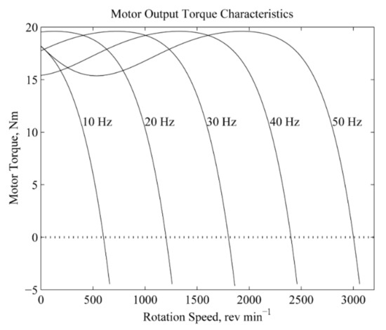 As the AC input frequency of the motor changes, the average operating speed changes accordingly and the entire curve translates along the x-axis. A frequency controller connected to the motor allows the adjustment of rotational speed. For simplicity, a six-order polynomial function is used to approximate the motor torque curve. This function is formulated based on the average operating speed of the motor and shown in Equation (23):