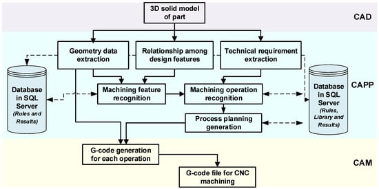 Nowadays, computer numerical control (CNC) is widely used in production industries, since various curve shape components can be produced with CNC machines with high efficiency and high quality [1,2]. CNC machines are also essential components of flexible manufacturing systems (FMS) and computer-integrated manufacturing (CIM) systems, in which manufacturing automation is utilized to achieve high productivity [3]. In any production system, process planning is an efficient way to increase quality and reduce manufacturing times [4]. The effects of process planning on production capacity and revenue increases have also been analyzed [5]. Additionally, CNC machining performance strongly depends on the cutting parameters that has been determined and assessed through complicated tasks, time-consuming the processes, and a high level of required engineering from calculation, simulation, or experimental works [6,7,8,9]. The recent development of computer software programs such as computer-aided design (CAD), computer-aided engineering (CAE), and computer-aided manufacturing (CAM) software has provided effective tools for parts design and manufacture. However, process planning was previously based mainly on engineers’ experience and expertise. Computer-aided process planning (CAPP) acts as a bridge between design and manufacturing in a CIM environment. CAPP involves a computer-converted module that incorporates the parts’ technical requirements and other information (e.g., relating to the materials, stock forms, and production types) to form operation sequences that are incorporated with process descriptions, such as descriptions for machine tools, cutting tools, and other equipment [10]. Process planning can be used for many purposes, such as for generating cutting toolpaths in computer-aided manufacturing (CAM) software, for scheduling manufacturing plans, and for production resource management. A CAPP system not only helps to reduce preparation times, but also helps to enhance productivity an automated factory [10,11]. There are two main methods in CAPP: (1) variant and (2) generative methods. In the first type, process planning is achieved by identifying and retrieving an existing plan for a similar part and applying certain modifications to form a new process plan. Although the programming technique used with this method is simple, optimization is not easy to achieve in many processes and the implementation quality still depends on the knowledge and skills of the engineers [12]. With generative method, process planning is implemented through technology databases, technology rules and constraints, and mathematical models combined with selection methods and optimal calculations [13]. Although it is difficult to develop, the generative method can perform process planning in detail and is easy to integrate with CAD–CAM–CNC systems. The generative method was applied in this research, with the main aim of creating a process planning method that is as detailed as possible and able to be integrated with a CAD–CAM–CNC system. In a CAPP system, a foundation method is necessary for machining feature recognition, machine tool and cutting tool selection, and machining operation procedures (process planning). Recent studies have shown that machining feature recognition methods only provide basic geometric information rather than complete information for the technical requirements, geometric intersection relationships and contour shape definition, which are important in process planning [14,15]. Feature recognition methods mainly focus on 2.5D features, such as slots, steps, and holes, but not on hybrid machining features, such as contour pockets with islands [16]. A workpiece’s technical requirements are mostly defined through the user interface for each feature or through separated procedures, thus diminishing the integrity of the CAD–CAPP connection [17,18]. The cutting tool selection methods have not been comprehensively evaluated using multiple criteria and they are not suitable for large-database systems with many types and sizes of cutting tools [19]. The methods used to select machine and cutting tools do not usually involve a flexible connection to the manufacturing database for each factory. Moreover, some processing parameters related to heat treatment, stock preparation methods, and product types are not considered in machining operation recognition and cutting tool selection processes [20]. Therefore, the selection results would not be adequate for practical applications. In the most recent studies, CAPP systems were mainly built to create a connection between CAD and CAPP systems through machining feature recognition systems using commercial three-dimensional (3D) CAD software or neutral CAD files [21,22]. The engineers manually applied the results from CAPP systems to generate the toolpaths for each machining feature in commercial CAM software. There have not been many studies on the automatic integration of CAD and CAPP with a CAM module. To create an integrated CAD–CAPP–CNC system, it is necessary to establish a bridge between CAPP and G-code programs, which are directly generated during the process planning in the CAPP system. However, such connections are still limited, since G-code files are mainly based on manual processing or are processed using commercial CAM software. Generally, three basic method types are used to create a G-code file for CNC machines: (1) the traditional manual programming method, (2) the automatic method, and (3) macro or parametric programming methods. The first method uses basic G-code commands and cycles for manual programming. This method is difficult to use for automated programming, since it requires a numerical coordinate for every programming point in each G-code block. The automatic method uses CAD and CAM software to create G-code files on the basis of toolpath strategies created by users. The programming function that uses application 