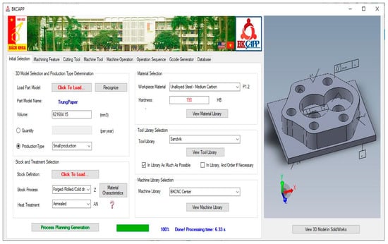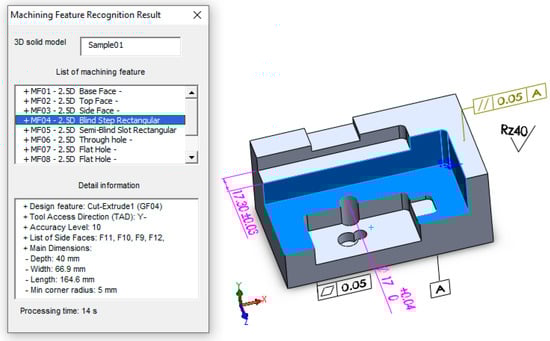 Figure 6 shows the main interface of the BKCAPP system, in which the input is a sample of a 3D model with technical requirements in SolidWorks format (*.sldprt), along with some initial manufacturing parameters, such as the product types or the number of parts per year, the stock preparation method, the heat treatment method, the workpiece material and hardness, and a cutting tool and machine tool library. The BKCAPP system is connected to a database while using a Microsoft SQL server to retrieve and store the processing and results data. The outputs are the lists of machines and cutting tools, the process plan, and the G-code files for the machining of parts. The workpiece sample used for the case study has basic technical requirements related to the surface roughness, geometric dimensions, and tolerance. The manufacturing parameters are: S45C steel for the workpiece material, small batch production type, forging method for stock preparation, annealing method for heat treatment, a specific machine tool library, and the Sandvik cutting tool library. The processing time for the machining feature recognition process for the sample is 9 s with the BKCAPP. The machining feature recognition module can recognize all features, such as the base face, top face, side faces, pocket, and holes, the basic dimensions and machining accuracy levels for which are described in Table 4. In addition to the basic dimensions of the machining features, the coordinates of points in the profile of the machining contour features (MF05) at the side faces were also extracted for the G-code generation process.