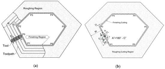 In finish machining, the finishing toolpath (i = n + 1) cuts off the finishing DOC to form a machined profile with the level of required quality that is determined in the process planning stage. The toolpaths in this step is slightly different than those in rough machining, as entry and exit toolpaths are added according to the curvature radius (R), which is specified by the programmer or by default calculation from the G-code generation module. Therefore, programming points for the entry (1→2→3) and exit (3→5→1) toolpaths, as shown in Figure 5b, are calculated on the basis of the geometry of the start profile segment (P1–P2), the curvature radius, and total DOC. Equations (2)–(6) show the calculation of these points’ coordinates based on angle C of the profile segment relative to the X+ axis.