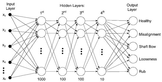 The network parameters, such as a number of layers, a number of neurons and types of functions used at the different stages, are adjusted by iterations and defined in order to obtain an accurate performance. This results in a feedforward network with four hidden layers, each of them with a variable quantity of nonlinear neurons, namely 1000, 100, 100 and 10, from layer 1 to 4, respectively. These details are also shown in Figure 1. The selected functions that are used are as follows: the transfer function at the hidden neurons is the hyperbolic tangent sigmoid []; the transfer function at the output neurons is sofmax []; the training function is scaled conjugate gradient backpropagation; and the performance function is cross-entropy from Matlab. The input layer moves forward along the hidden layers, finishing with the result delivery from the decision layer, which has five possible classes as outputs relating to five rig conditions, namely, healthy, misalignment, shaft bow, looseness and rub.