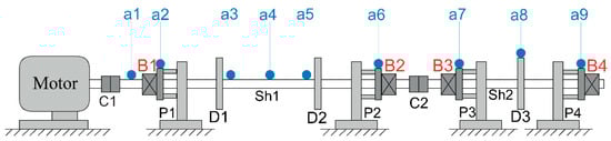 The measured vibration data from an experimental rotating rig are used in the study []. A schematic of the rig is show in Figure 2. It consists of two steel shafts (Sh1 and Sh2) with a 20 mm diameter coupled through a rigid coupling (C2) and supported through four grease-lubricated 20 mm internal diameter SKF (FY 20TF) flanged ball bearings (B1 to B4) on the flexible bearing pedestals (P1 to P4). The shaft (Sh1) that is 1.0 m in length is connected to a three-phase electric motor (0.75 kW, 3000 RPM maximum) by a flexible coupling (C1). The shaft is carrying two balancing discs (D1 and D2), while the second shaft (Sh2) with a length of 0.5 m is carrying a balancing disc (D3). The balance disc dimensions are 125 mm in diameter and 14 mm in thickness. The flexible bearing pedestals (P1, P2, P3, and P4) are secured by bolts to a steel base that acts as rigid base foundation of the machinery with a high mass. The measured natural frequencies [] of the rig are 50.66 Hz, 56.76 Hz, 59.2 Hz and 127 Hz, and their mode shapes are shown in Figure 3. The measurement locations for the modal tests used by Nembhard, Sinha et al. [] are also marked as a1 to a9 in Figure 2 of the rig.