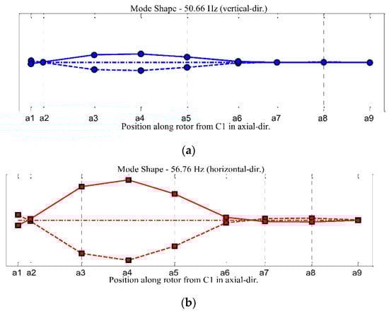 Experimental mode shapes: (a) 50.66 Hz, vertical direction dominant; (b) 56.76 Hz, horizontal direction dominant.