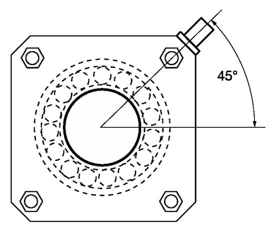 The measured vibration acceleration data at the bearing housings are available at the rotor speeds of 1800 RPM (30 Hz) and 2400 RPM (40 Hz) for the rotor conditions from healthy (with residual unbalance and possibly little misalignment) to the different faulty conditions []. The data details are listed in Table 2. The accelerometers of sensitivity at 100 mV/g and a frequency range of up to 10 kHz are used. The accelerometers are mounted at each bearing housing at an angle of 45 degrees from both vertical and horizontal directions for these experiments []. This is shown in Figure 4. The measured vibration data are collected to the PC through a 16-bit data acquisition device at a sampling frequency of 10 ksamples/s [].