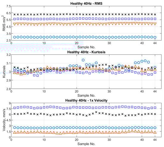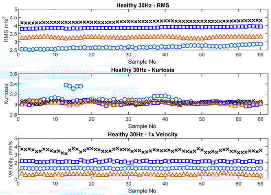 Figure 10, Figure 11, Figure 12, Figure 13 and Figure 14 show similar trend plots for the machine’s healthy and faulty conditions when operating at 2400 RPM. The observations are also similar to the behaviours observed at the machine speed of 1800 RPM.