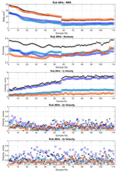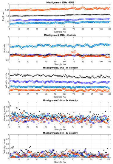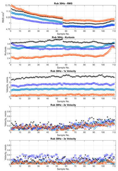 Initially, the measured vibration data are analysed in both time (RMS and Kurtosis) and frequency (spectrum) domains. These analyses are commonly used techniques in the industries [,]. The spectrum analysis is carried out in the vibration velocity, which is useful for rotor faults detection [,].