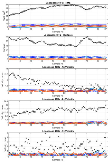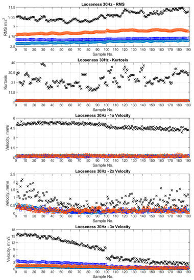 Nembhard, Sinha et al. [] have used both time and frequency domain features for the development of a fault diagnosis model. The model has used the time domain features (RMS, crust factor (CF), Kurtosis (K)) and the frequency domain features (1x, 2x, …, 5x amplitudes) of the acceleration signals. The study has successfully demonstrated the combinations of different machine speeds and the different machine foundations in the diagnostics model. However, the authors used all data simultaneously for the development of their model. Therefore, the model is not tested blindly. This model was then further modified by Luwei, Sinha et al. []. The features are slightly modified based on rotor dynamics. Since the velocity spectrum is better for the rotor-related faults [], the frequency domain features are changed to the 1x, 2x,…, 5x amplitudes of the velocity spectra []. It is observed that the classification and diagnosis of the different machine conditions are improved further. These features are used again to develop the VML model as discussed in Section 2. Data inputs are prepared as