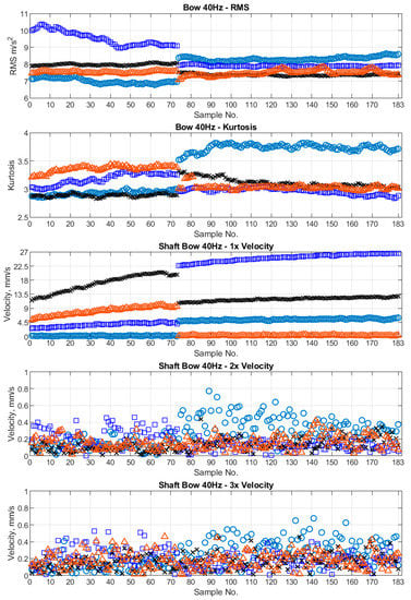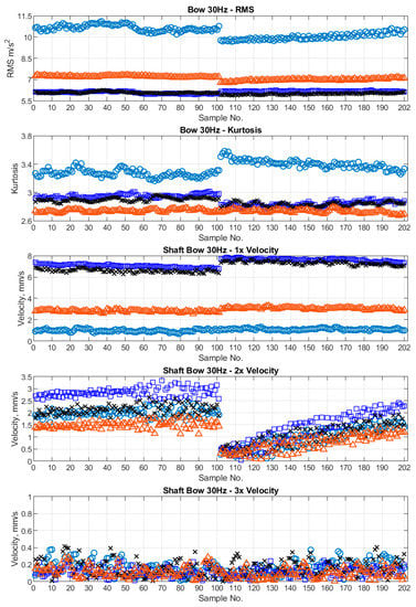 Figure 5 shows the time domain (RMS and Kurtosis) and frequency domain features (1x amplitude) for all 66 sets (66 runs) for the healthy condition. The values are nearly stable and constant at each bearings for all sets, as expected. Only 1x values are shown because the health spectra are dominant at 1x only. Figure 6, Figure 7, Figure 8 and Figure 9 show similar trends for the faulty conditions from misalignment, looseness, shaft bow and shaft rub, respectively. These figures also include the trend of velocity at 2x and 3x amplitudes along with 1x amplitude. This is because the faults generally generate higher harmonics and subharmonics depending upon fault types [,]. The misalignment condition represents the misalignment between the motor shaft and the long shaft (Sh1) near the bearing B1. However, the faulty (looseness, bow and rub) conditions at a speed of 1800 RPM consist of two cases which are clearly seen in Figure 7, Figure 8 and Figure 9. Looseness represents looseness in the bearing pedestal P3 at 2 different levels; similarly, rub near disc D1 with two different clearances between the rotor and stator, and the shaft bow in the long shaft and short shaft are separately simulated in the experiments. It is also obvious that both looseness and rub are changing with time (different data sets), which indicates the propagation of faults with time.