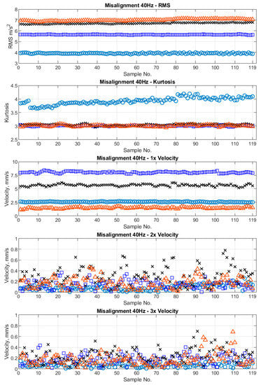 Estimated RMS and Kurtosis from the measured acceleration signals and their 1x, 2x, 3x velocity spectra values for the misalignment condition at 2400 RPM (B1, circle; B2, square; B3, cross; and B4, triangle).