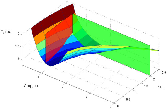 The minimum values of the root-mean-square torque and, consequently, the power of the electromechanical converter are obtained when the kinetic energy of the working body and engine is equal. It should be noted that the amplitude of the resonant maximum of the frequency response in this case can be significant. In the article, the value of 10% is taken as the permissible value of the difference in the thickness of the rolled products [13,14,15,16], which can be achieved only with a strict limitation of the oscillation of the processes of the electric drive system at the level of 15% (see Figure 2, red limit plane).