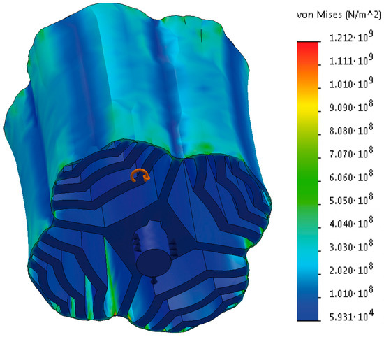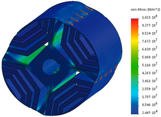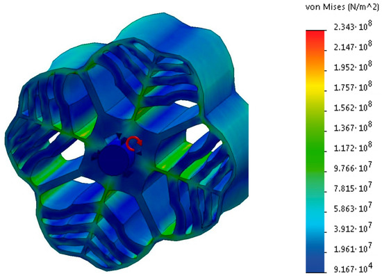 The studies carried out allow us to conclude that, in this configuration, the rotor does not have sufficient mechanical strength. Taking the above into account, it was proposed that the minimum size of the rotor back for a given standard size of the machine be at least 4 cm and that a jumper be placed in the radial direction. An example of the distribution pattern of mechanical stresses under centrifugal forces is shown in Figure 5.