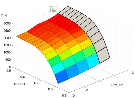 The optimization of the weight and size of the IESRM was carried out numerically. However, in order to take into account the complex design of the magnetic system, the finite element method was used. The results of the optimization problem are presented by the dependency of the magnitude of the electromagnetic torque T on the ratio of the inner diameter of the stator Din to the outer diameter Dout and the size of the rotor back Srot.