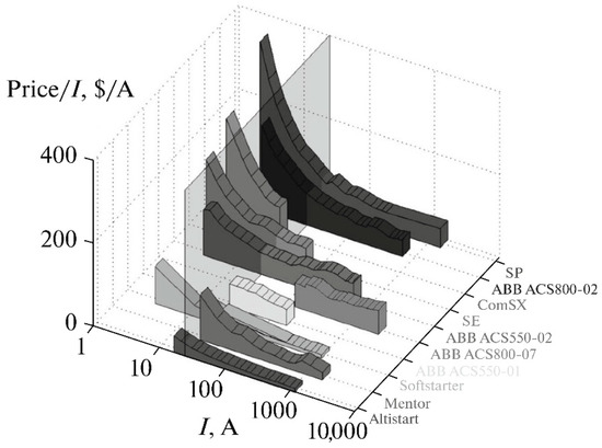 We start solving the multicriteria problem of optimizing the power circuit circuits by analyzing the costs of semiconductor converters [19,20,21]. For this purpose, a statistical analysis of the data available in open sources was performed. The regression dependencies of the unit cost of electrical converters on the current load were obtained for well-known and proven manufacturers (Figure 7).