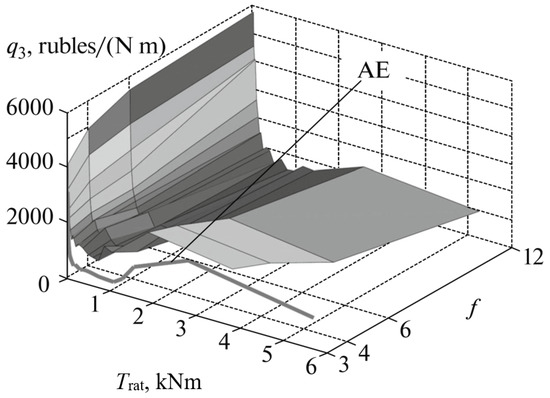 The AE curve (Figure 8) shows the dependency of the index on the installed power for a standard asynchronous electric drive. This curve lies below the surface and this is because the index takes into account not only the cost of a semiconductor converter but also the cost of an electrical machine.