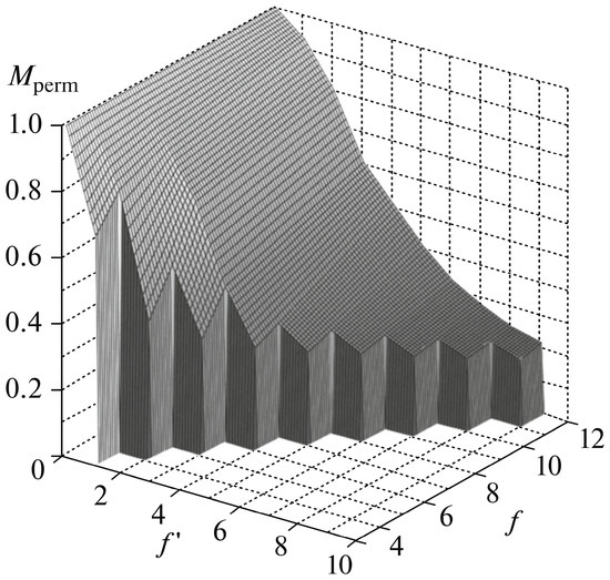 Figure 9 shows the dependency of the permissible torque on the total number of phases of the power circuit diagram f and on the number of failed phases f’. The results showed that if one of the phases fails for a circuit with a phase configuration from the condition f > 6, it leads to a slight decrease in the permissible torque. For a power circuit with six phases, this decrease does not exceed 5%, and for 12 phases—2%. The presented dependency also allows us to quantify the reliability of a polyphase circuit. If circuits with six phases are used, then the probability of failure-free operation will be 0.92, and in a 12-phase configuration, this figure reaches 0.95.