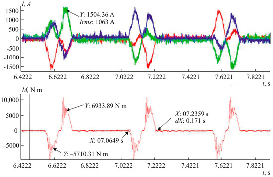 Figure 10 shows the oscillograms of the processes that were recorded by a Fluke 192 V digital instrument. The oscillograms show that the time constant of the transient process in the torque control loop did not exceed 0.001 s, and the uniform frequency bandwidth was at least ωs = 1000 rad/s. Comparing the oscillograms of current and torque shows that the relationship between the electromagnetic torque and current was linear, even in the zone of significant overloads. Thus, the overall speed of the electric drive of the swing mechanism was increased about three-fold, and the overall productivity of the mill was improved by about 10–15%.