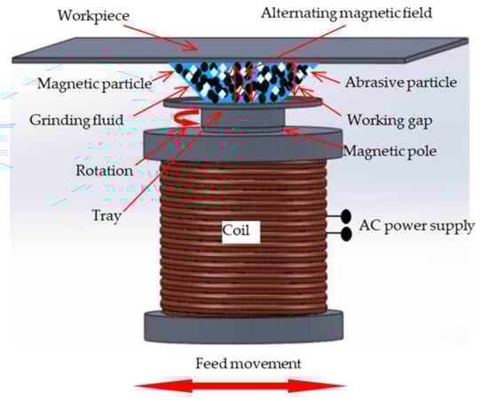 The corrosion and fatigue failure of machine elements undoubtedly cause huge financial losses. Excellent surface quality can improve the corrosion resistance [1] and fatigue strength [2] of the material to a certain extent. In addition, for some precision machinery, surface finish is also an important factor that is indispensable to perform its functions. Traditional finishing methods to achieve nano-level surface finish usually lead to a significant increase in production costs [3]. The magnetic abrasive finishing (MAF) process is considered to be an effective method to improve the surface finish. The grinding tool of the MAF process is the magnetic brush composed of tiny particles combined under the action of the magnetic field [4,5]. The MAF process realizes the material removal (MR) by the relative movement of these tiny particles and the workpiece [6,7]. In addition, due to the flexibility of the magnetic brush, it can be applied to the finishing of complex surfaces, such as curved surfaces [8] and groove inner surfaces [9]. The advantages of the MAF process are attracting more people to discuss.