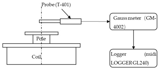 In addition, the magnetic flux density was measured in the experiment. The schematic diagram of the measurement principle is shown in Figure 3. The magnetic flux density above the axis of the magnetic pole is measured using a gauss meter (GM-4002) and probe (T-401) produced by EMIC (Tokyo, Japan). When measuring, the sensing area of the probe is placed above the magnetic pole axis. The magnetic flux density changes are recorded by a logger (midi LOGGER GL240 produced by Graphtec Corporation, Yokohama, Japan).