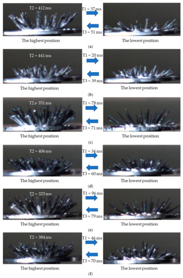 Figure 5 shows the photos of the lowest and highest positions of the magnetic cluster in the case of sinusoidal alternating current (Sin-AC) and square alternating current (S-AC). In the figure, T1 is the time for the magnetic cluster to drop from the highest position to the lowest position, T2 is the time for the magnetic cluster to stay at the highest position, and T3 is the time for the magnetic cluster to rise from the lowest position to the highest position. When the size of the MPs is the same, T2 is longer than in S-AC as compared to Sin-AC. As the size of the MPs increases, T2 increases when the current waveform is the same. At the same time, the difference in T2 of the two waveforms gradually decreases, with the increase in size of the MPs. When the magnetic cluster is in the highest position, it means that it will have a higher finishing efficiency than other positions.