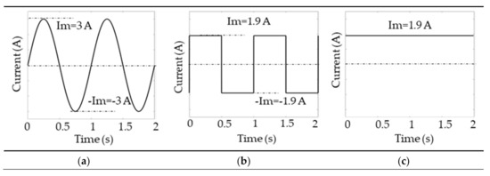 Current waveform diagram. (a) sin-AC, 1Hz; (b) S-AC, 1Hz; (c) DC.