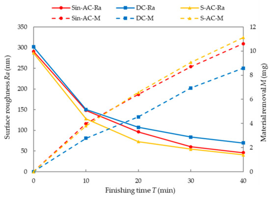 The effect of the current waveform on surface roughness and MR is shown in Figure 7. It can be seen that the amount of MR is the least and the surface quality is the worst at DC. This is mainly because, in the case of Sin-AC and S-AC, the magnetic cluster constantly fluctuate with changes in current. This fluctuating motion can continuously update the APs in contact with the workpiece, thereby ensuring the stability of the finishing tool. Therefore, the finishing efficiency is higher than in DC. In the case of S-AC, the amount of MR is slightly higher than that of Sin-AC, and the surface roughness changes faster than Sin-AC. In order to analyze the reason, the change of magnetic flux density was measured.