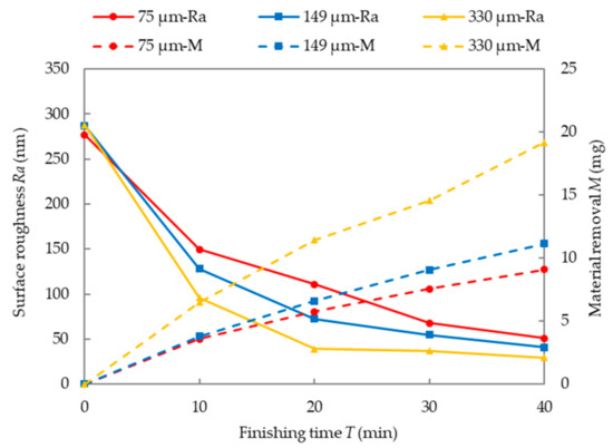 The effect of abrasive particles size on surface roughness and material removal. (Magnetic particles: 149 μm, current waveform: S-AC, frequency: 1 Hz, rotational speed: 350 rpm).