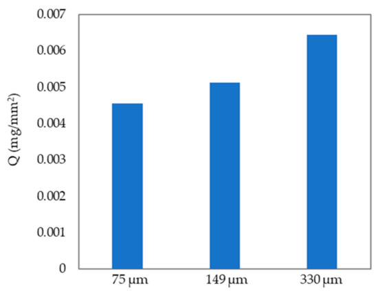 The Q at different particle sizes is shown in Figure 11. According to Figure 9 and Figure 11, it can be seen that as the size of MPs increases, Q increases, and the surface roughness changes faster. This is mainly because the increase in the size of the MPs will increase the finishing force, thereby increasing the finishing efficiency [26].