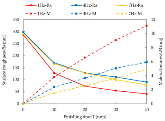 Figure 12 shows the effect of current frequency on surface roughness and MR. It can be seen that as the frequency of the current increases, the amount of MR decreases significantly. The surface quality is best obtained at 1 Hz. According to the comparison between the measured value and the reference curve in Figure 8, it can be seen that the magnetic flux density is relatively weakened during the magnetization process and relatively enhanced during the demagnetization process. But in the case of S-AC, the degree of weakening is significantly greater than the degree of enhancement. Therefore, as the frequency of the current increases, the degree to which the magnetic flux density is weakened increases. In turn, the finishing efficiency is reduced.