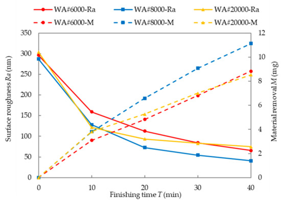 At WA#8000 and WA#20000, obvious finishing traces can be seen. According to Figure 14 and Figure 15, in the first 10 min, the peak tip of the workpiece surface will be preferentially removed. During this process, APs enter the gap between the two peaks to cut the peak tip, which mainly depends on the tangential force. In the next 30 min, as small peaks on the surface are gradually removed, material removal in a relatively flat area mainly depends on APs being pressed into the workpiece. During this process, the material removal amount of a single AP mainly depends on the sliding distance and the projected area of the pressed workpiece, which is not only related to the tangential force but also to the normal force. When other conditions are the same, the total normal force is not much different. When the weights of APs are the same, the number of APs is more at WA#20000. The increase in the number of APs disperses the normal force, which reduces the normal force acting on a single AP, thereby reducing the penetration depth. As shown in Figure 15b,c as the size of the APs increases, the depth of the finishing mark also increases. Therefore, when the sliding distance is the same, the MR of a single AP increases. This leads to a decrease in the MR of WA#20000 in the following 30 min.