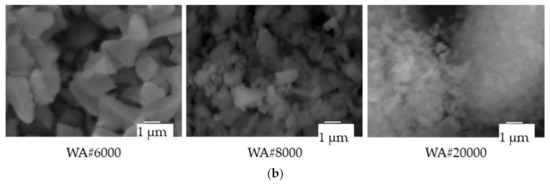 Figure 13 shows the effect of APs size on surface roughness and MR. It can be seen that the highest MR and the best surface quality are obtained when using WA#8000 APs. In addition, at 10 min, the MR and surface quality changes of WA#20000 are close to WA#8000. But in the next 30 min, the change rate of surface roughness and MR gradually slows down. In order to explore the reason, the initial workpiece surface and APs were observed, as shown in Figure 14. It can be seen from Figure 14a that the initial surface of the workpiece has large grooves and is also full of small grooves. Figure 14b shows that there are significantly more small particles at WA#20000.