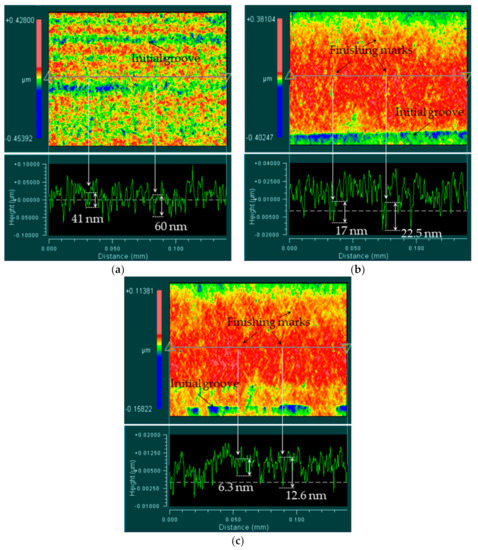The Photographs of the workpiece surface after finishing (White Light Interferometers). (a) WA#6000; (b) WA#8000; (c) WA#20000.