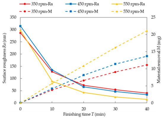 Figure 16 shows the effect of magnetic pole rotation speed on surface roughness and MR. It can be seen that as the rotation speed increases, the finishing efficiency increases. In the abrasive micromachining process, the material removal rate (MRR) can be given by the following equation [30]: