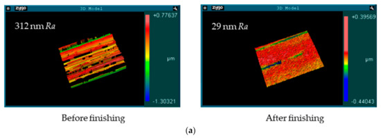 Figure 17 is the 3D photographs of the workpiece surface before and after finishing. It can be seen that the small grooves on the surface after finishing at the three rotational speeds are almost completely removed, but some large grooves are still not removed at 350 rpm and 450 rpm. The best surface quality is obtained when the magnetic pole rotation speed is 550 rpm.