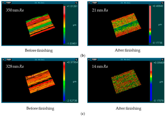 3D photographs of the workpiece surface before and after finishing. (a) 350 rpm; (b) 450 rpm; (c) 550 rpm.