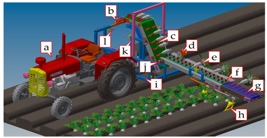 3-dimensional model of the tractor-mounted radish collector system showing the major components: (a) tractor, (b) second conveyor motor, (c) second conveyor belt, (d) stem cutter (e) radish, (f) rubber bit, (g) first conveyor belt, (h) furrow guide, (i) collector-base, (j) first conveyor motor, (k) safety frame, and (l) hanging rods of the radish collecting bag.