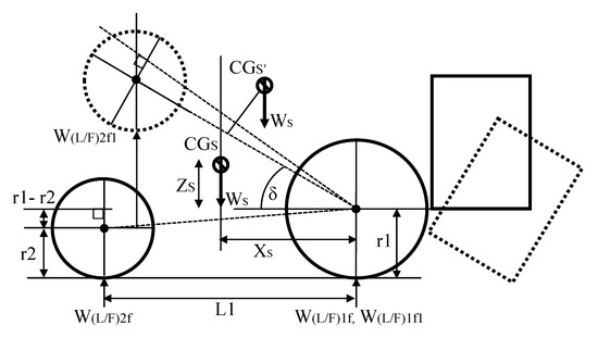 where WTF1, WTF2, WTR1, and WTR2 refer to the mass of two front (F) and two rear (R) wheels, δ is the tilt angle, L1 is the wheelbase, W(L/R)2f1 is the load on the front wheel when lifted up, WT is the mass of tractor, WS is the mass of whole system, W1 and W2 are the lengths of front and rear axles, respectively, and r1 and r2 are the radii of the rear and front wheel, respectively.