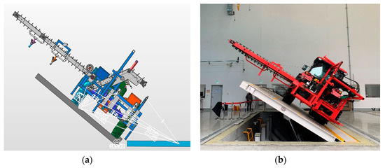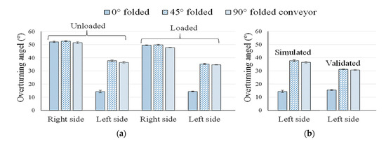 Lateral overturning angles were determined through simulation considering different folding positions of the conveyor belt under unloaded and loaded conditions, and the left side overturning angles were validated through tests as illustrated in Figure 6. The average right and left side overturning angles determined by simulation under unloaded and loaded conditions were 52.06°, 37.12°, and 49.01°, 34.96°, respectively. Furthermore, 32° was the average validated overturning angle on the left side (except the 0° folded condition of the conveyor because the expanded conveyor touched the platform at 15° during the overturning tests).