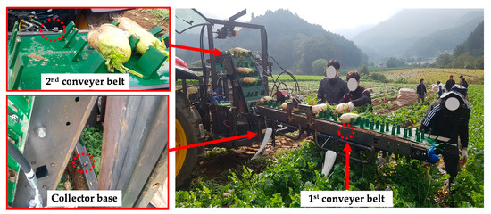 Radishes (Raphanus raphanistrum subsp. sativus) are one of the most popular vegetables in many South Asian countries (e.g., Korea, Japan, China, India), and the annual production of radishes in Korea, Japan, and China in 2018 was 0.467, 1.328, and 44.600 million tons, respectively [1,2,3]. It is an annual or biennial crop grown in open fields. Radishes are rich with vitamins, minerals, and other beneficial components (i.e., glucosinolates, isothiocyanates, anthocyanins) [4,5,6]. Nevertheless, the rate of radish cultivation is decreasing in many countries, such as the 19.5% yield and 18% acreage of daikon radish having decreased in Japan from 2006 to 2018 [2] due to the associated labor-intensive and time-consuming cultivation process, reduction in workforce as a result of aging, increasing labor wage, and low mechanization of the process [7,8,9]. Plantation, inter-cultivation operations, and harvesting all require a lot of labor. Manual harvesting, collecting, and packaging of radishes are the most labor-intensive processes. The mass of each harvested radish varies from 1 to 3 kg, and they all need to be pulled out, collected, and carefully transported to avoid damage. The ratio of labor in harvesting and transporting work is about 26.7% [10], and the mechanization rate of upland crop harvesting is 13.3% [10,11]. Therefore, radish collectors are in urgent demand in many countries for mechanized harvesting and collection operations [12,13,14]. Overturning stability and vibration levels need to be seriously considered with respect to field machinery because farms for upland crops are usually uneven and sloped, which may cause work-related fatalities, and vibration affects operator comfort and also reduces the durability of machinery components.