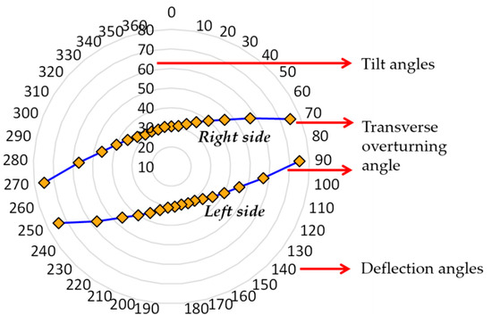 Mathematical analysis of the transverse stability of the tractor–collector system under the loaded condition was conducted using Equation (7) with a 10° counterclockwise increment of the declination angle (γ) over a range of 360°. Figure 5 shows the radiating circle, which represents the overturning angle direction of the radish collecting system. Right lateral overturning occurred when the tilt angle was at least 30.5°, and the range of deflection angles was from 80 to 260° counterclockwise. In addition to this, left lateral overturning also occurred when the tilt angle was at least 30°, and the range of deflection angles was from 260 to 80° counterclockwise.