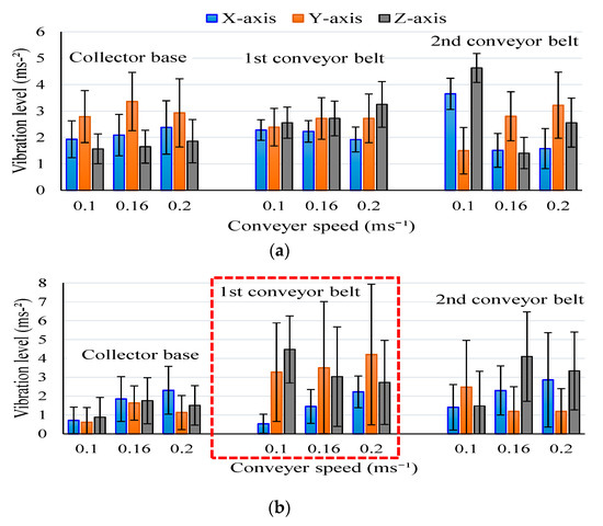 Figure 7 shows the maximum measured vibration levels regarding the X, Y, and Z axes in the conveyor base, first conveyor belt, and second conveyor belt for the 0.10, 0.16, and 0.20 ms−1 conveyor speeds, and unloaded and loaded conditions. Similar vibration levels were observed under the unloaded condition of the radish collector (Figure 7a). Therein, the highest vibration (4.63 ms−1) was observed in the second conveyor belt. Figure 7b shows the vibration levels during the loaded condition. Random vibrations with high standard deviation were observed in the first conveyor belt compared to the conveyor base and second conveyor belt. Therefore, PSD analysis was performed to investigate and understand the repetition of this random vibration.