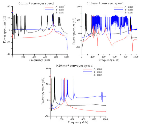 The power spectrum of the three directions (X—longitudinal, Y—transverse, and Z—vertical) for 0.10, 0.16, and 0.20 ms−1 conveyor speeds under the loaded condition of the first conveyor belt is shown in Figure 8. The frequency range in the X axis was 0 to 1000 Hz, and the Y axis represents the power spectrum in 20log10 (W/Hz) scale. High magnitude peaks are observed for all conveyor speeds in all directions; however, the frequent emergence of peaks is observed for the 0.16 ms−1 conveyor speed in the Y direction. All high magnitude peaks were around 30 dB, which indicated a high probability of damage to the first conveyor belt and hampering of user comfort.