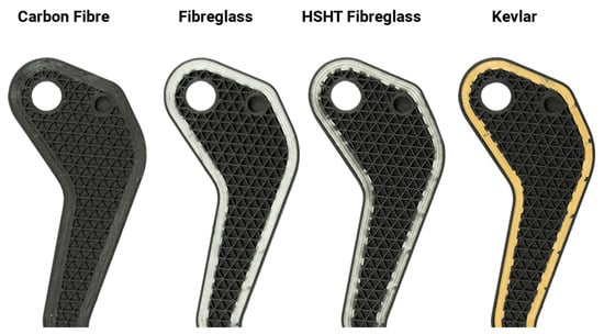 15]. The second technology consists of introducing continuous reinforcements between the layers of thermoplastic material during the printing process. After completing the application of the declared number of layers of the base filament, an additional nozzle applies a layer of the reinforcing component, also in the form of a wire, according to the pattern declared in the CAD model. The reinforcement material can be Kevlar, glass fiber, carbon fiber or high strength high temperature glass fiber, shown in